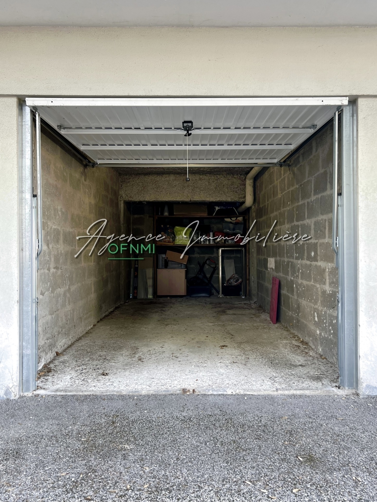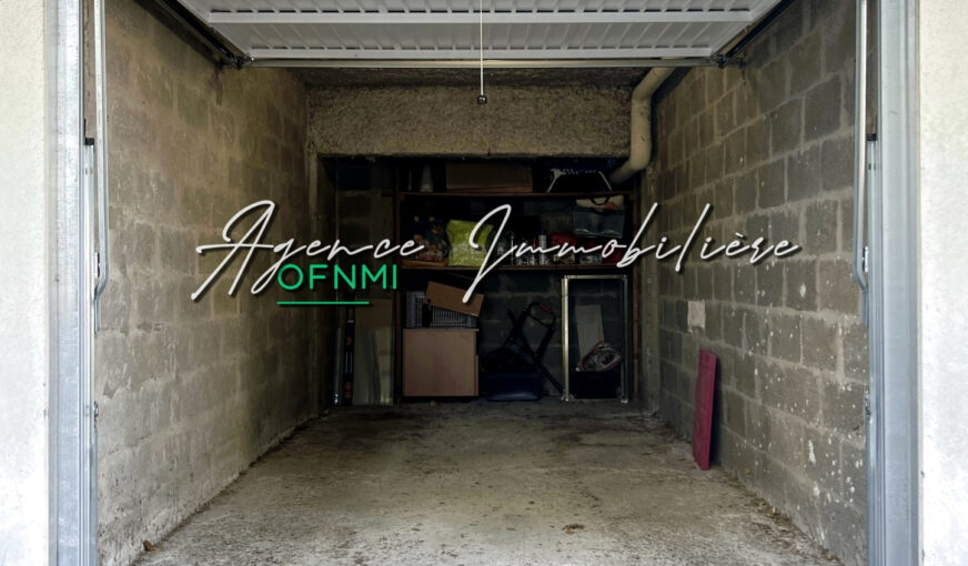 – GARAGE, 13,50 m2 : porte de garage neuve, étagère en fond de pièce.