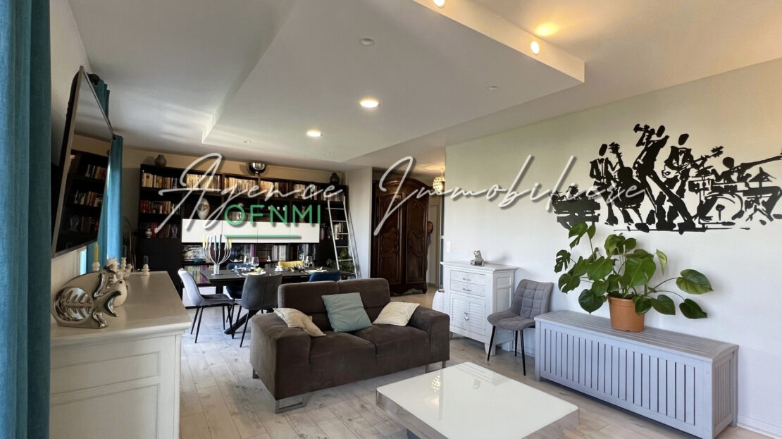– HALL OUVERT SUR SÉJOUR DOUBLE, 37,61 m2 : Beau volume sur balcon, plancher stratifié effet cérusé, éclairage indirect en caisson.