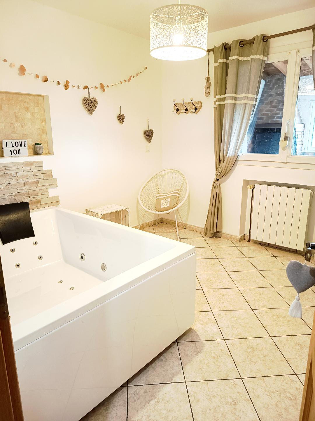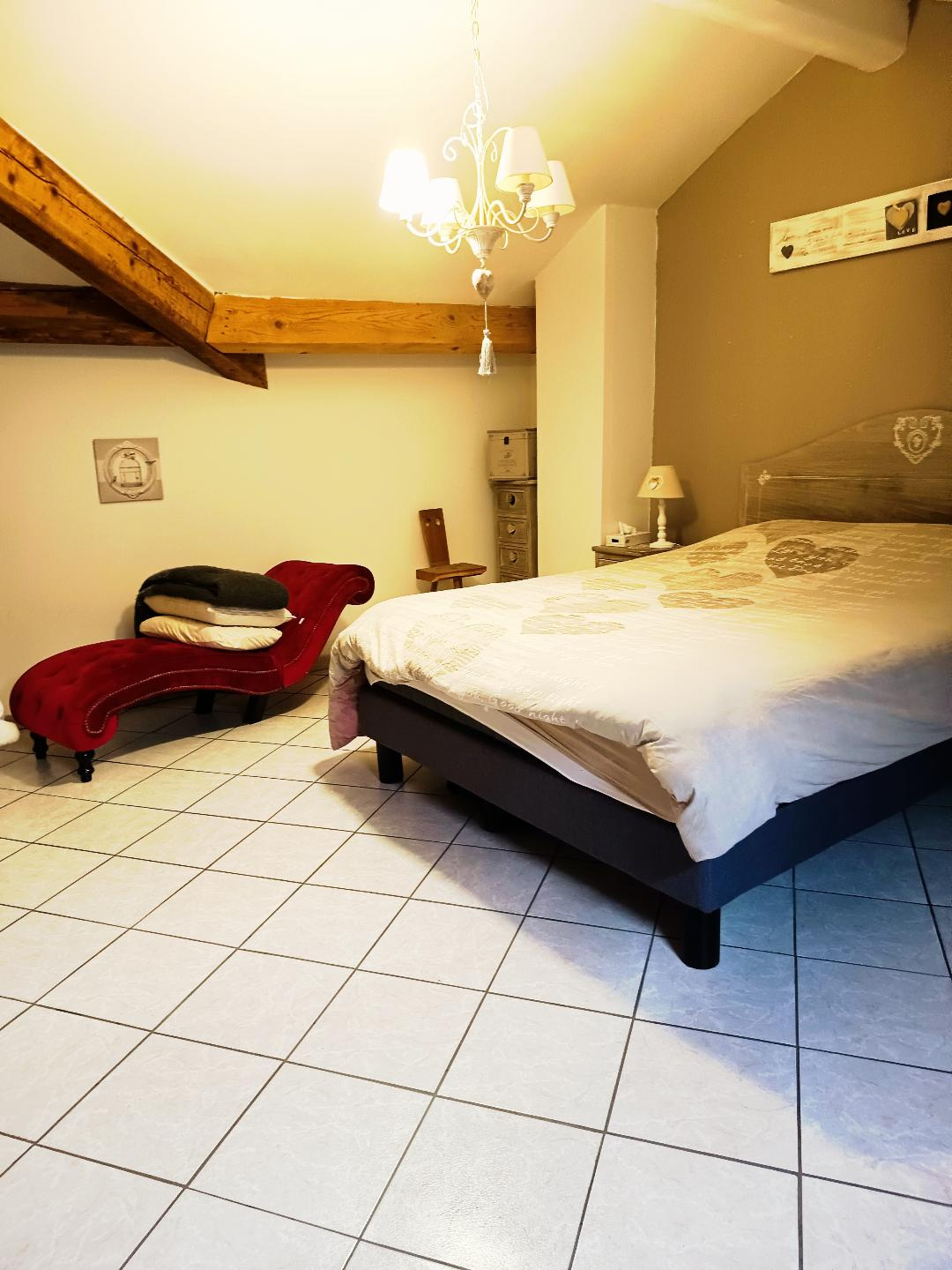 Une grande chambre romantique équipée d’accessoires coquins et d’une ambiance unique une douche double et WC et l’étage