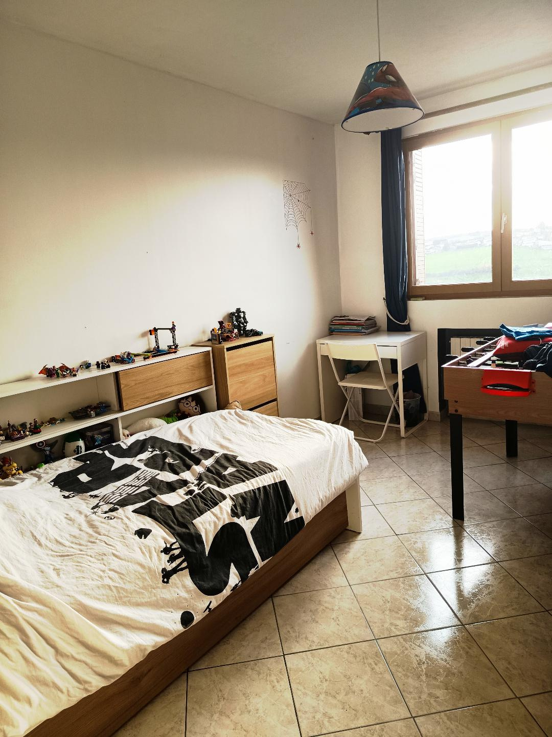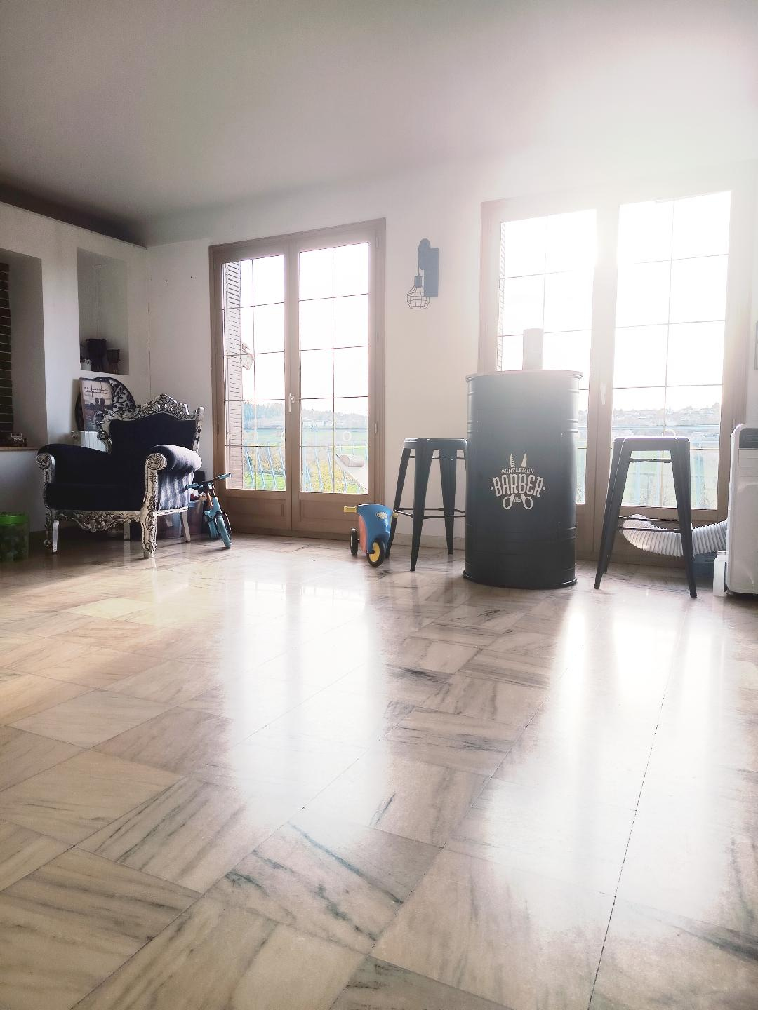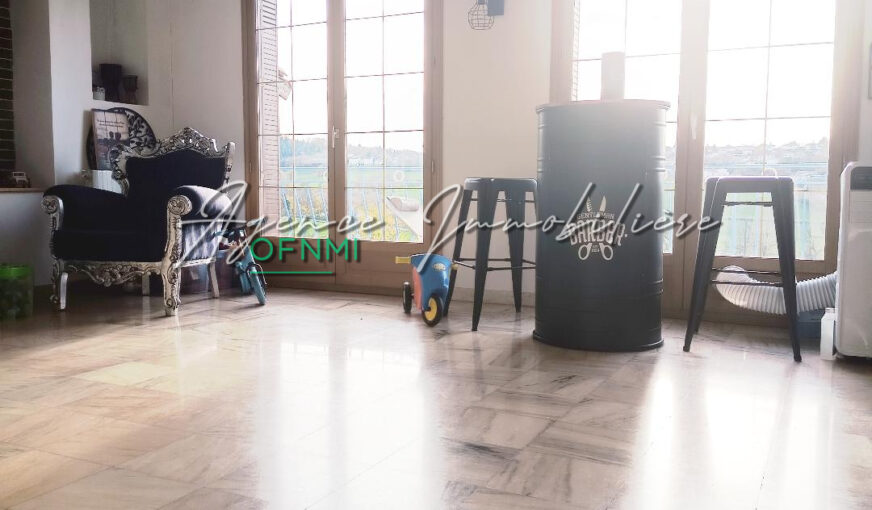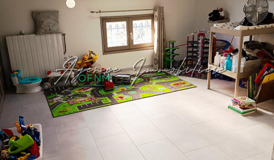 Étage : très grande chambre de 20m2 environ, chambre d’enfant avec placard encastré, salle de bain avec dressing intégré ainsi qu’une pièce qui sert de salle de jeu ou de musique ou de réception des enfants (20m2 environ).